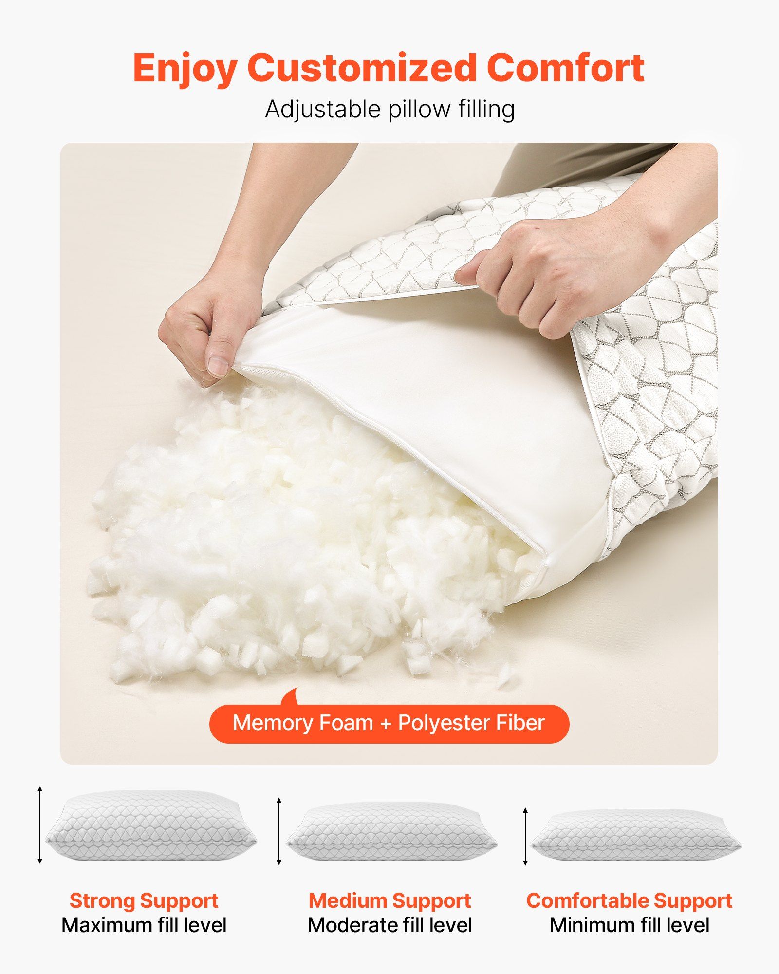 Our bed pillow includes 1/2 lbs of filling to customize your pillow's height and firmness, ideal for different sleep positions and personalized comfort.
